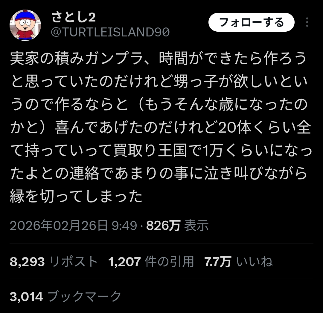 | … | 8226/02/27(金)12:11:25No.1405990134+>>作ってから捨てるくらいが丁度いいんだけどなガンプラ |