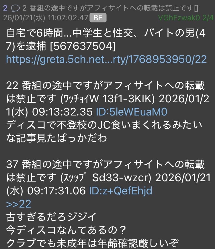 | … | 8026/01/21(水)18:44:53No.1394597981+俺も踊る方のディスコだと認識して読んでいたわ… |