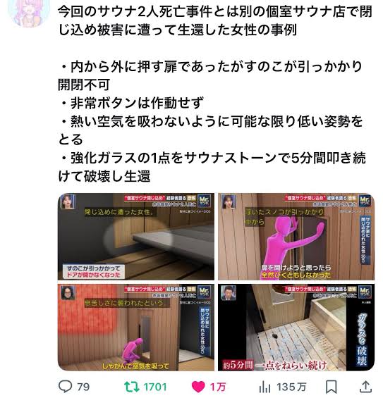 | … | 2426/04/24(金)09:05:41No.1423263299+>非常ボタン作動しないサウナ多いな… |
