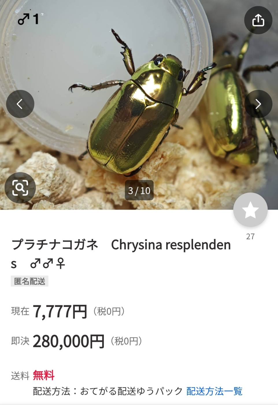 朝ヤフオク見てたら生きてるプラチナコガネが出品されててビビったレス23件省略。全て読むには返信ボタンを押してください。