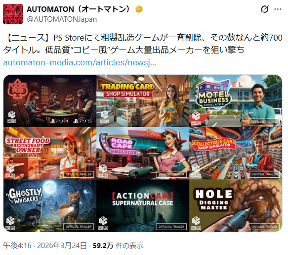 >なおNOSTRA GAMESの公式Discordサーバーにおいては、今回の一斉削除について管理者が言及。PS Store側の対応は同社にとって予想外であり、削除について正確な理由は共有されなかったと主張している。また今後も同社はSteamやMicrosoft Store、ニンテンドーeショップでの販売を続けていくとのこと。