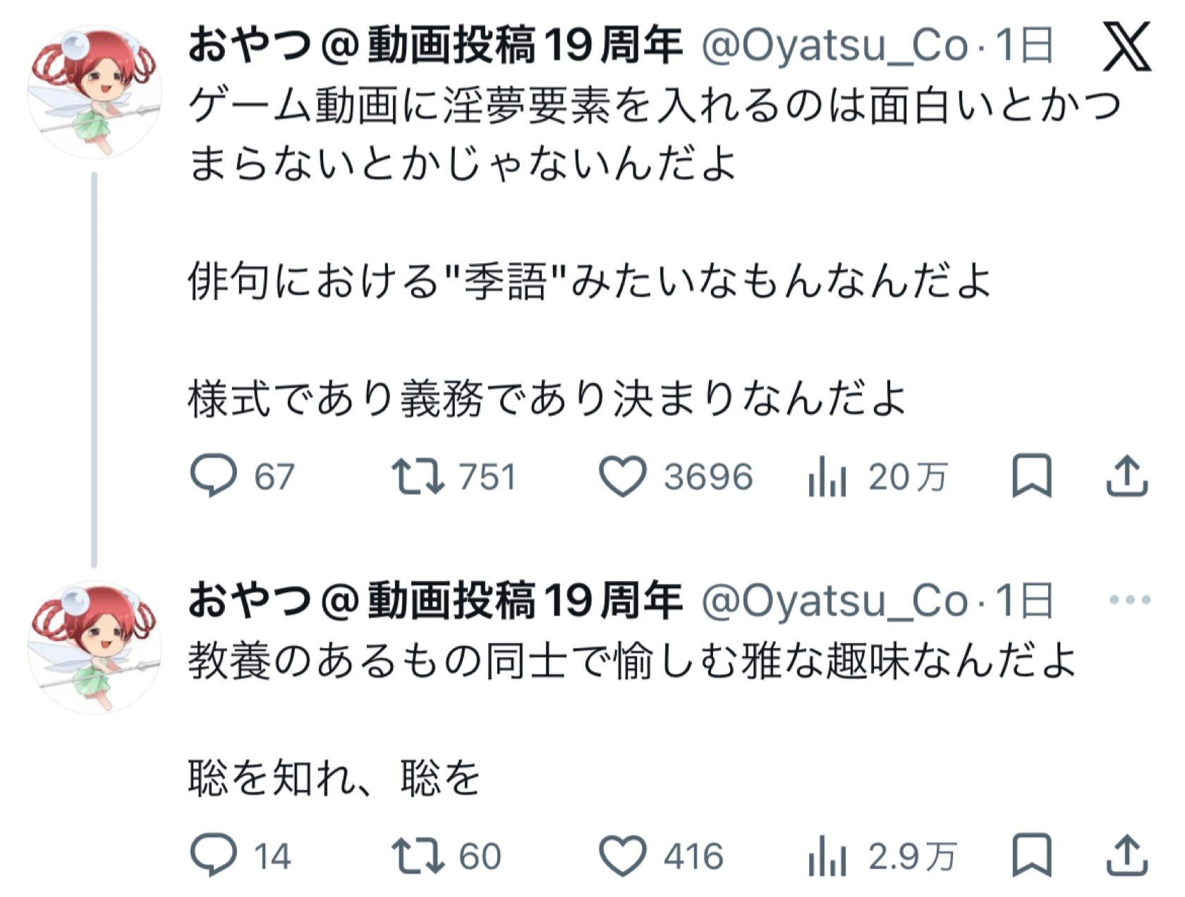 | … | 3926/04/02(木)12:44:47No.1416561870+おやつは元から人気あったから淫夢で擦り寄る必要なかったのに |