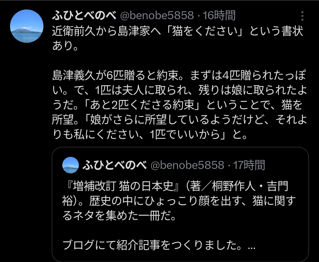 | … | 3326/04/07(火)12:30:52No.1418073353+前に旅行で鹿児島行った時 城山に登ったんだけどめちゃくちゃ猫 多かった |