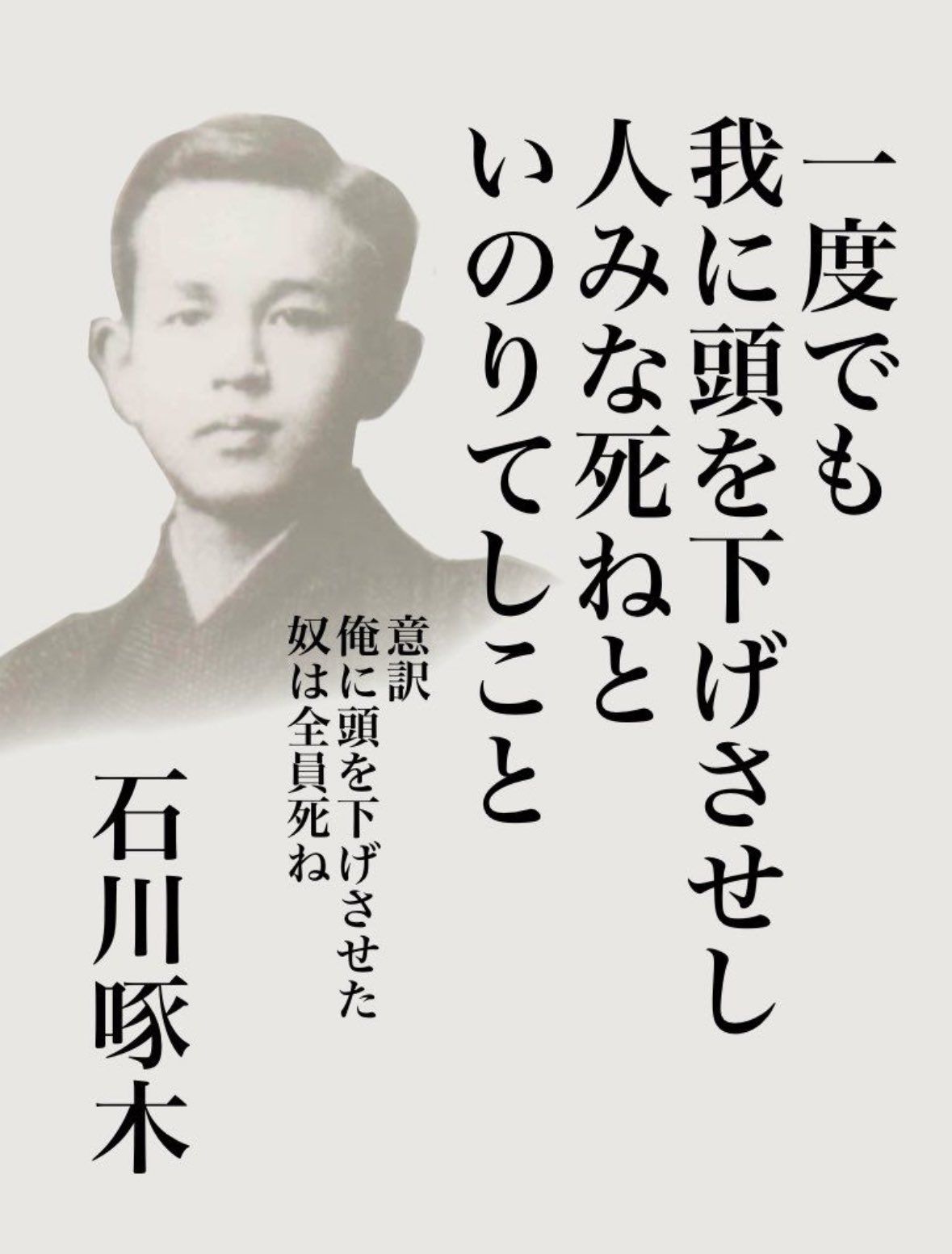 | … | 725/11/13(木)17:57:53No.1372246247+>この短歌は、滞納した家賃や借金の取り立てなどに追われ、頭を下げて詫びなければいけなかったことに屈辱を感じて作ったと言われており、ますますどうしょうもない。 |