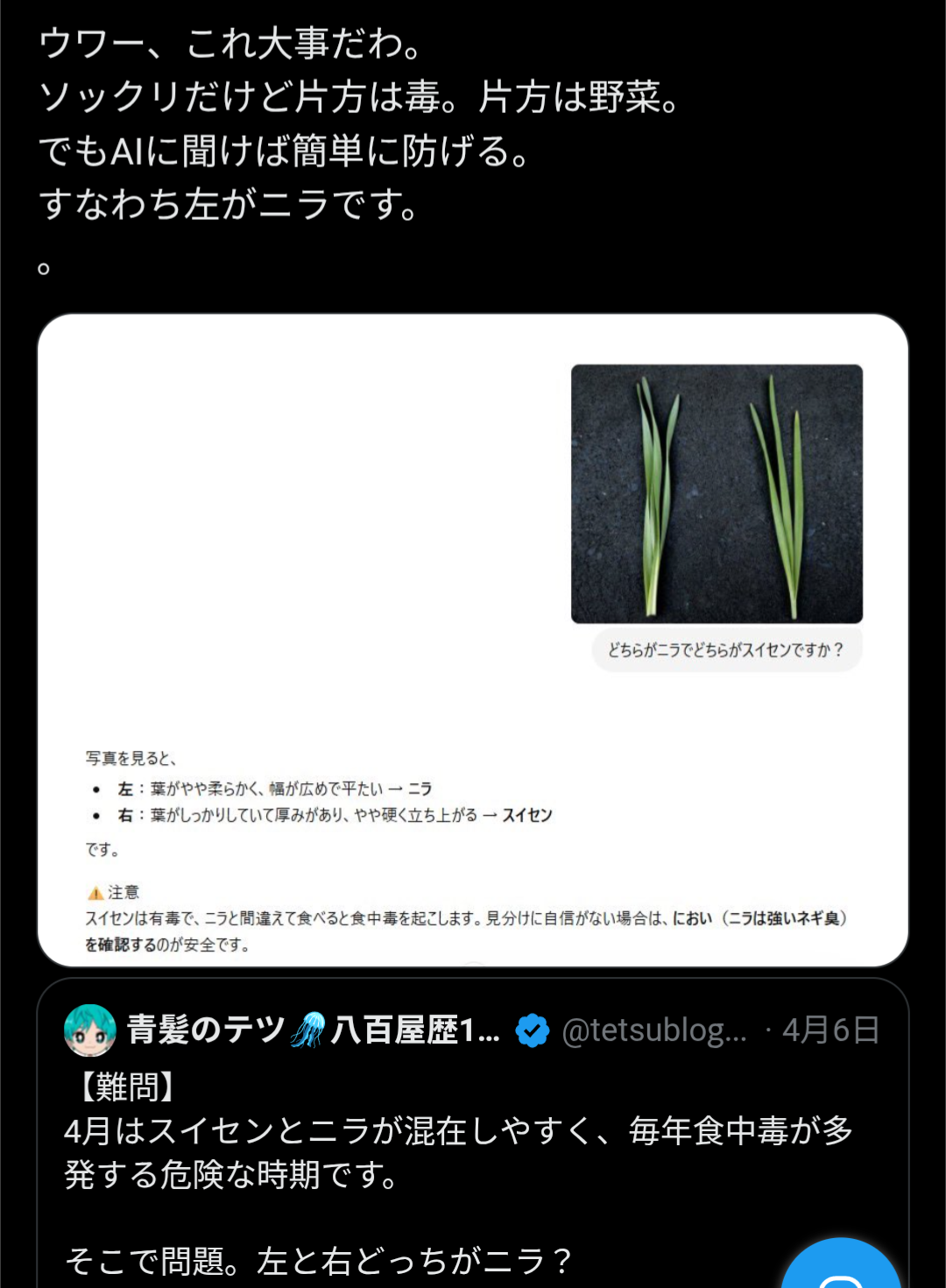| … | 2026/04/07(火)12:19:03No.1418070132+なんか庭にどう見てもニラみたいなのが生えててびっくりしたんだけど |