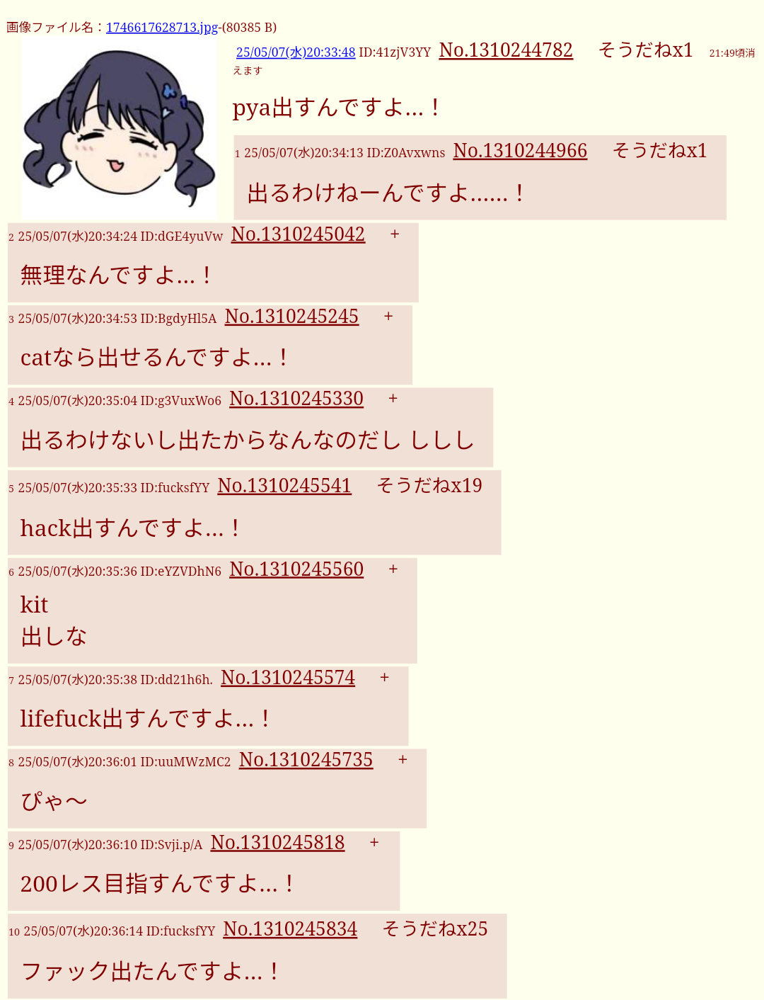 | … | 726/04/19(日)13:30:09 ID:phgR0wlANo.1421807977+ピャッ |