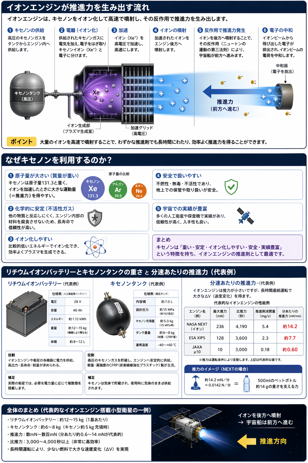「イオンエンジンが推進力を生み出す流れとなぜキセノンを利用するのかとリチウムイオンバッテリーとキセノンタンクの重さと分速どれくらいの推進力を生み出せるのかを全て図解」ってリクエストで生成させた画像の正しさを検証して
