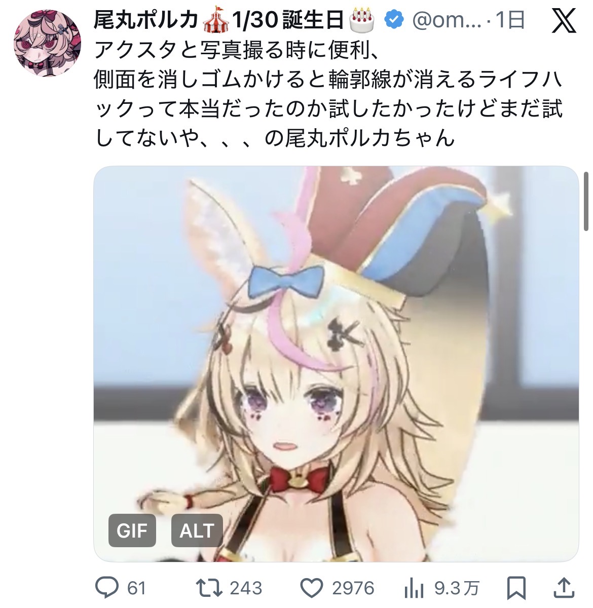 | … | 926/01/14(水)09:04:01No.1392331736+俺も自認アクスタだから消してもらおうかな輪郭線 |
