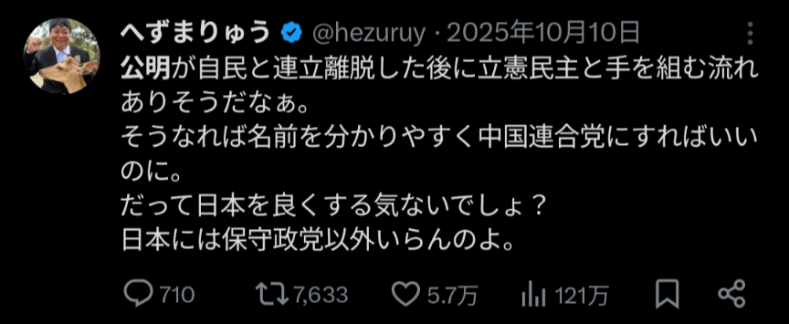 10月へずま「立憲と公明は手を組む。名前は中国連合だ」