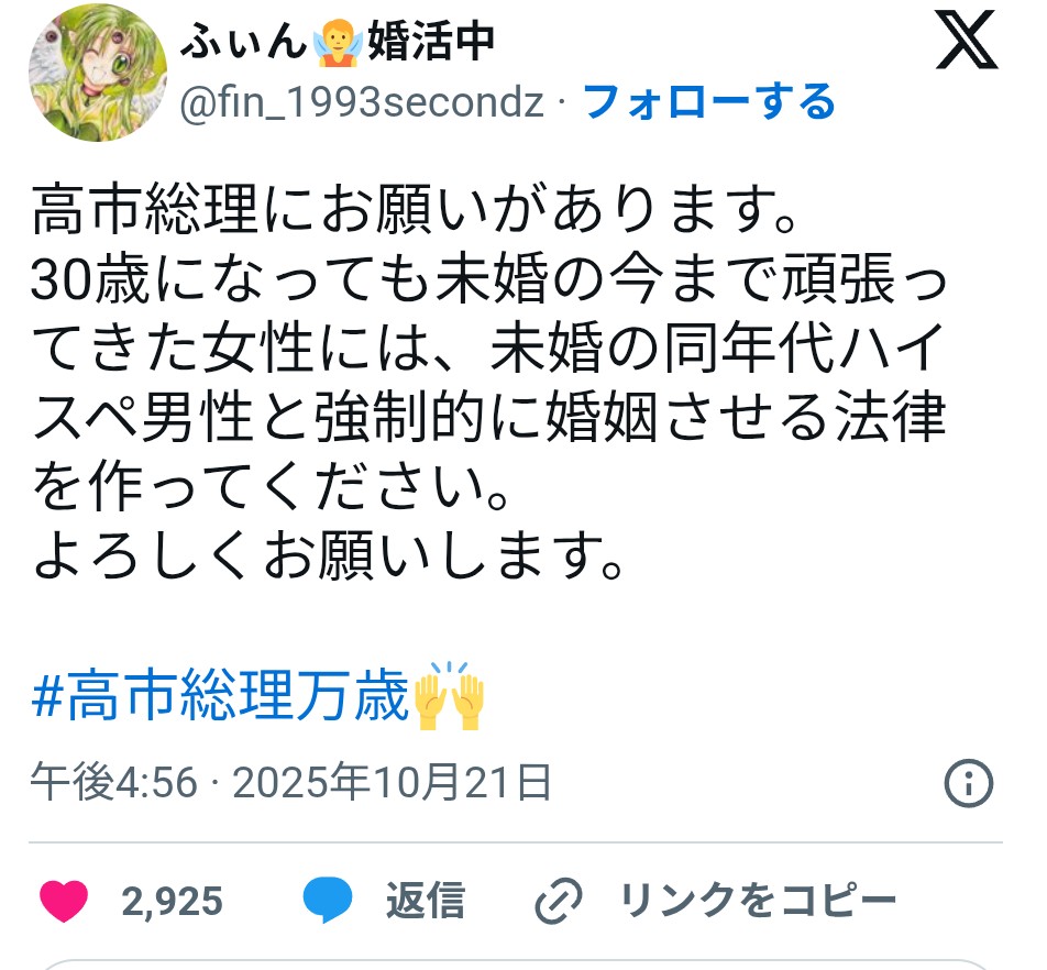| … | 526/02/08(日)21:26:20No.1400141354+>未婚のハイスペ男性をご用意願います |