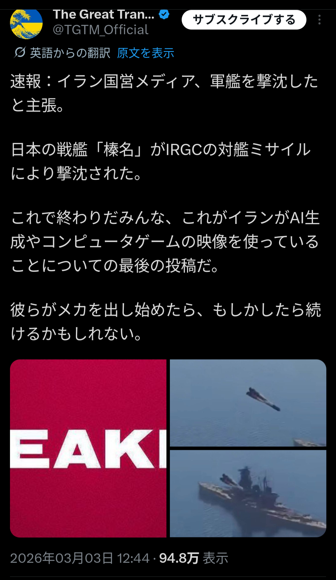 | … | 2426/03/04(水)17:57:41No.1407652059+ウクライナがロシアの軍艦を撃沈ってこの画像出されたら普通に信じるだろうしなあ |