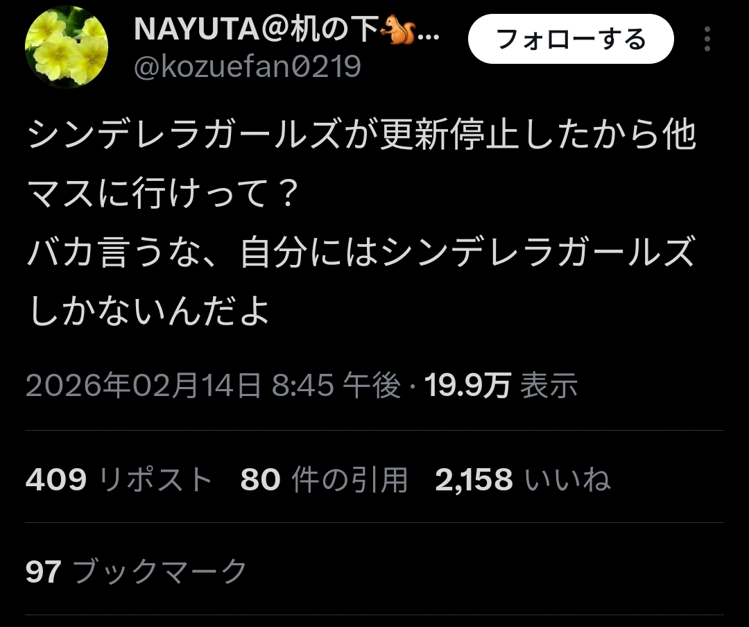 | … | 1626/02/15(日)21:37:08No.1402412771+なんならこの負け惜しみを言いに行ってる |