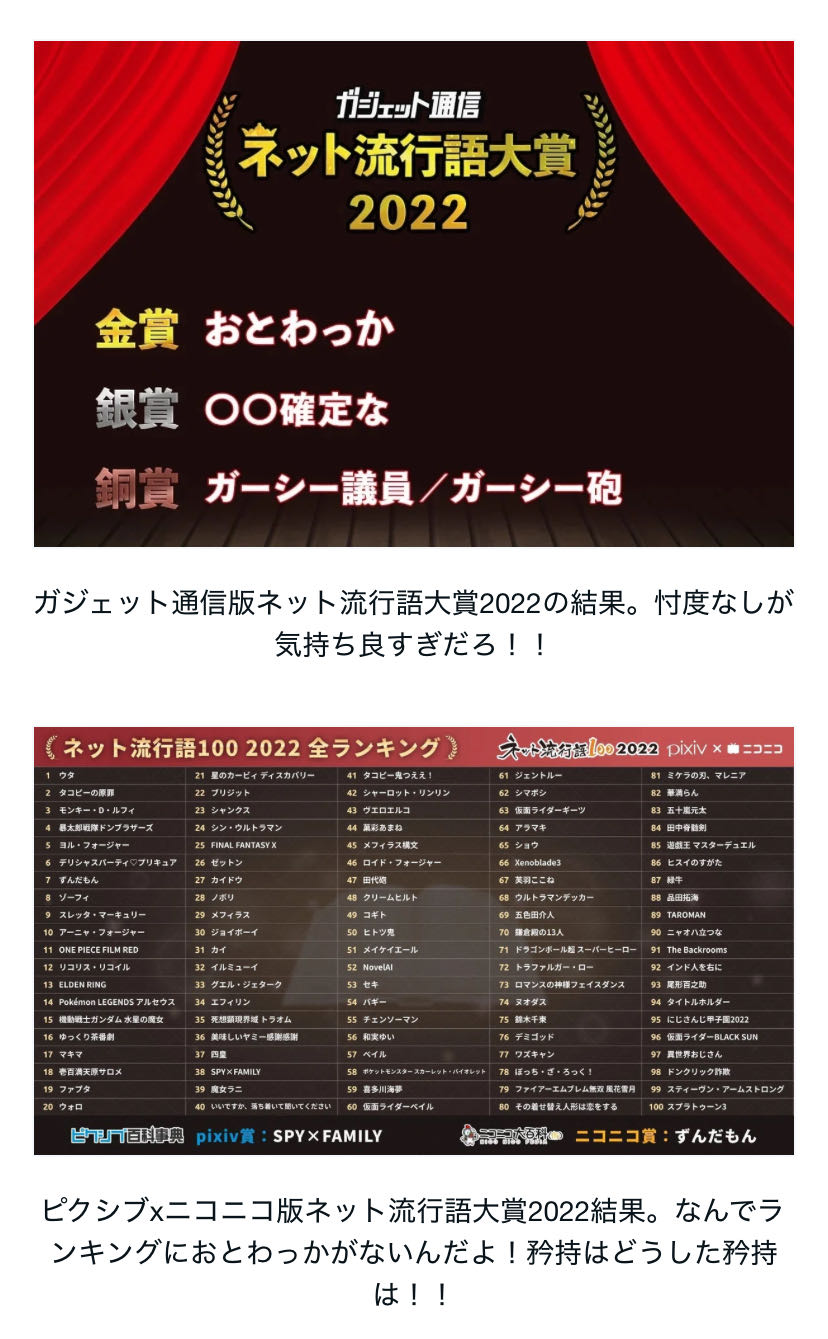 | … | 626/02/21(土)10:21:00No.1404019512そうだねx4流行語って言いつつ作品名やキャラ名で埋め尽くすの馬鹿馬鹿しいからやめたら? |