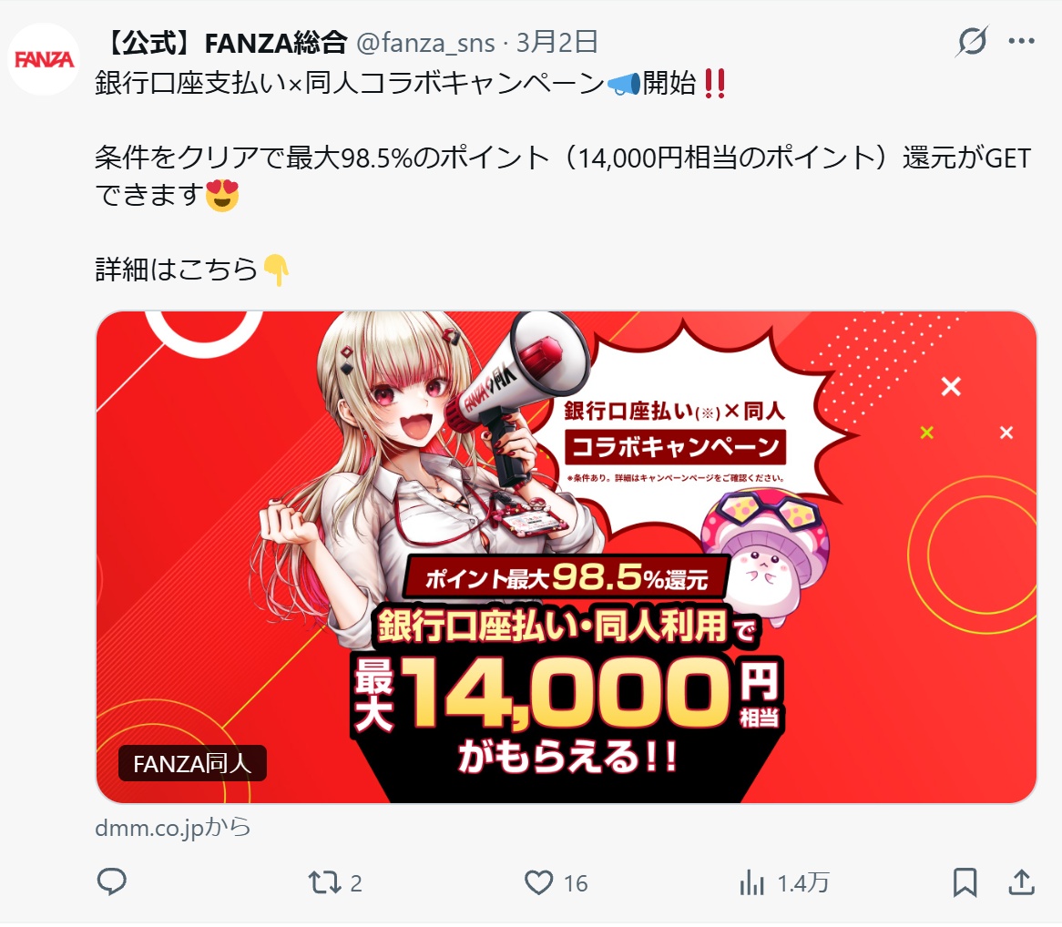 FANZAのキャンペーンのツイートが流れてきたんだけど