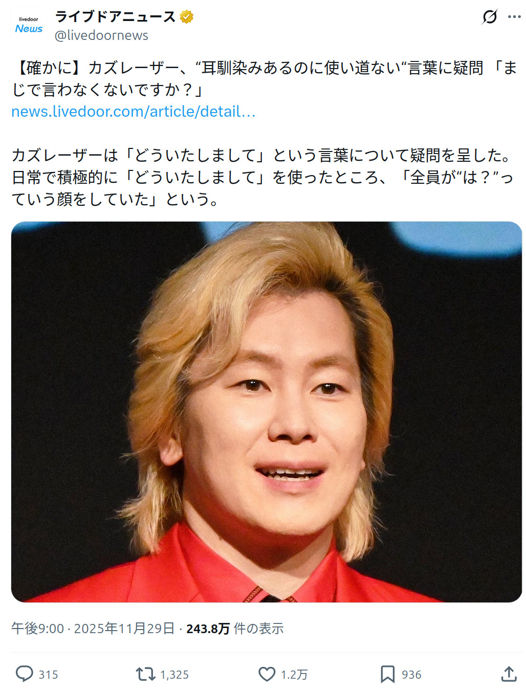 | … | 2025/11/30(日)09:11:57No.1377640128そうだねx5カズレーサーが使う場面なんて芸人みたいな低民度の集まりだろ? |