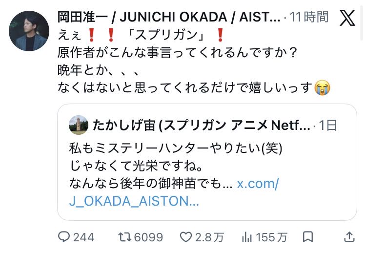 | … | 226/03/15(日)19:45:35No.1411082468そうだねx3岡田さんめっちゃ喜んでんじゃん |
