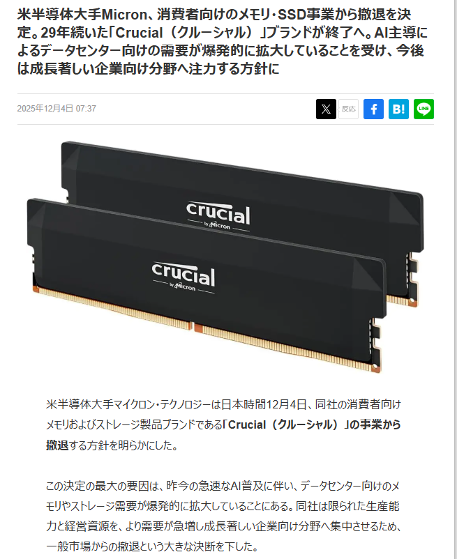 | … | 1025/12/10(水)15:35:39No.1381037703+ていうかエンドユーザーが急にメモリ増やしたところでどうなるの |