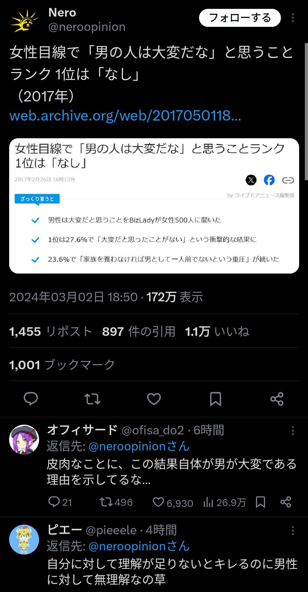 | … | 3326/02/20(金)11:27:56No.1403723114+女の方が大変でも男なんか大変そうだとは思わないは余りにも共感性がなさすぎるでしょ… |