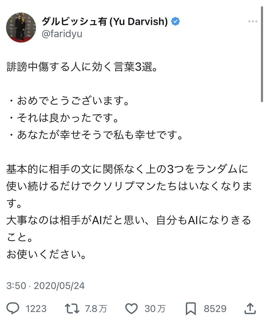 | … | 5726/03/17(火)15:04:49No.1411613005+>ダルビッシュくらいの有名人だと構ってもらえるだけで嬉しい層がいそう |