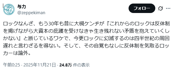 | … | 1025/11/22(土)23:19:28No.1375217272+そもそも今のロックバンドは反体制を掲げてないだろ |