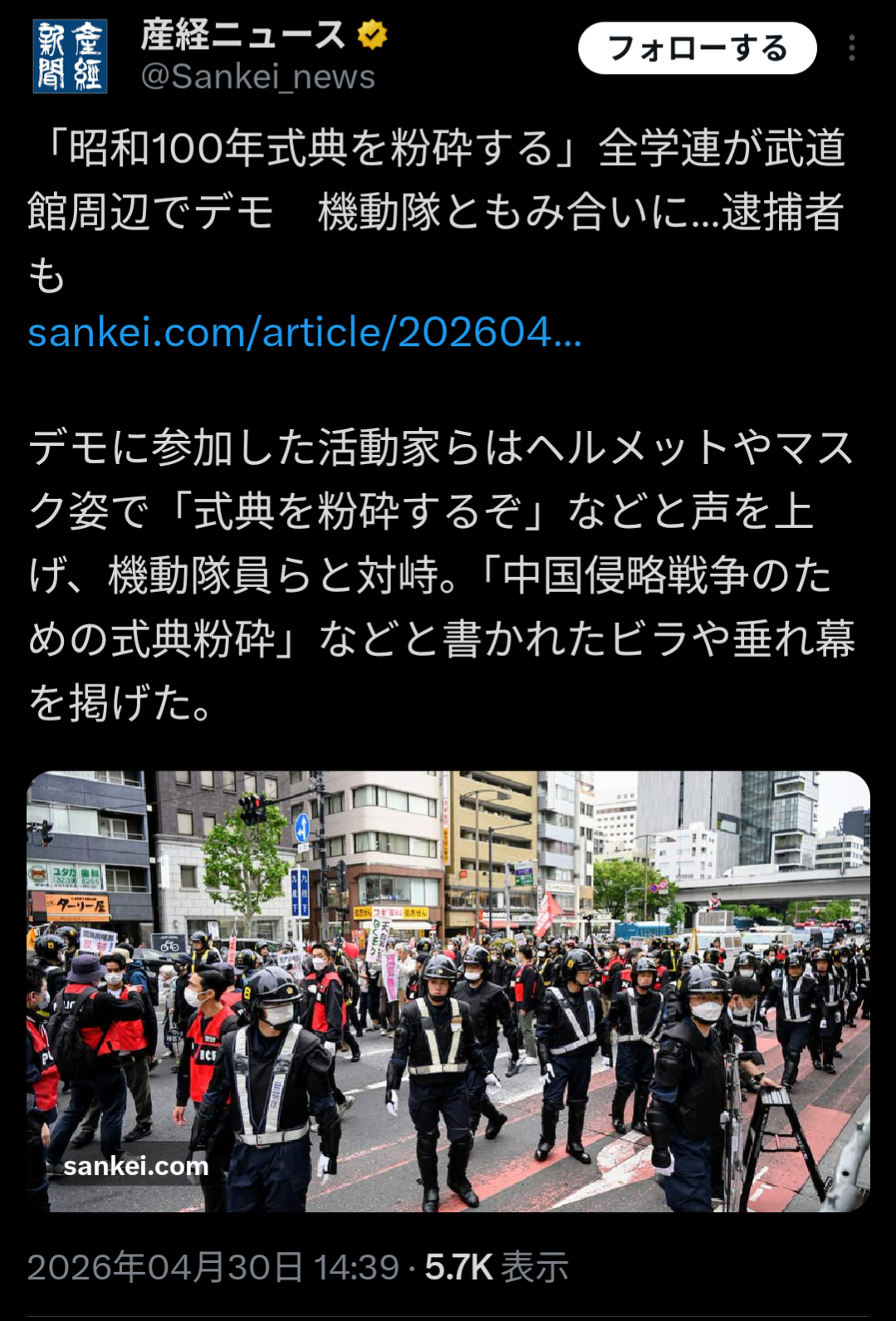 | … | 526/04/30(木)22:00:38No.1425415408+昭和から100年経ちましたってだけの式典破壊するのがなんで中国のためになるんだ? |