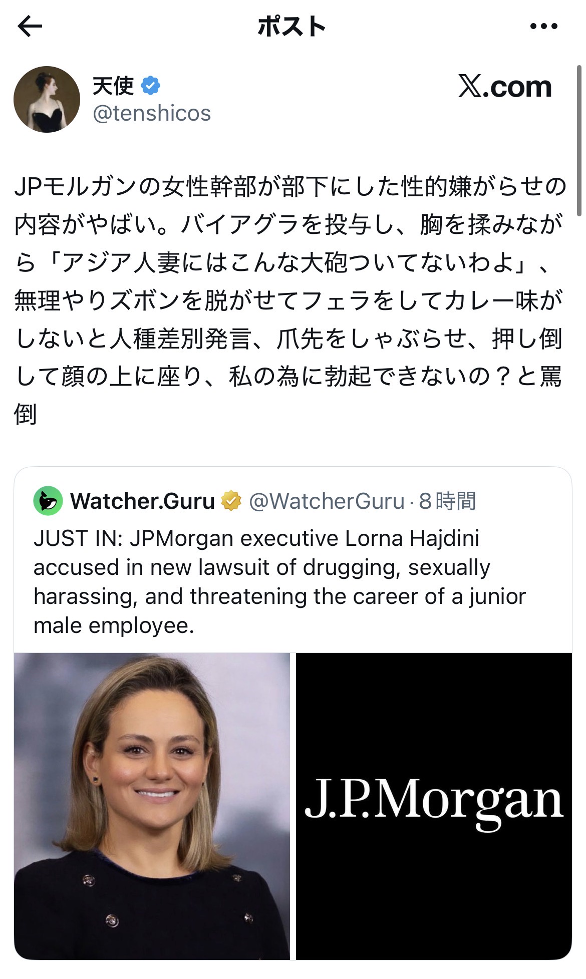 | … | 1126/04/30(木)22:05:42No.1425417448そうだねx1JPモルガンの幹部に上り詰めるような女がつましくおしとやかだとでも思っていたのか |