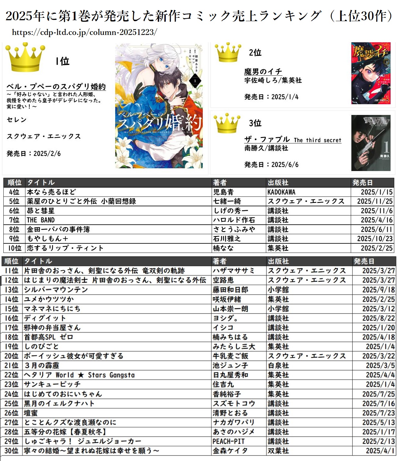 | … | 7926/01/18(日)17:51:46No.1393708530+これ確か全国書店の紙の売れ行きだけで計測したやつだから紙がさっぱりで電子だけバカ売れしてる漫画とかは入ってない可能性はある |