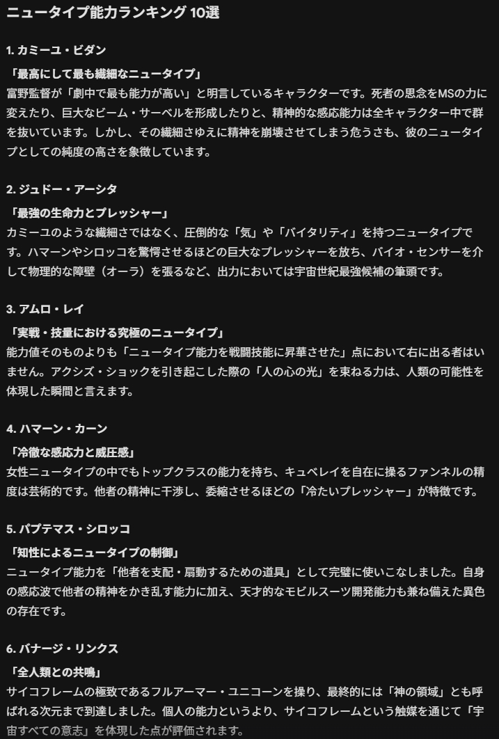 | … | 3126/04/08(水)09:30:53No.1418317870そうだねx3ジュドーそんなにニュータイプ力だけで見た時高いか? |