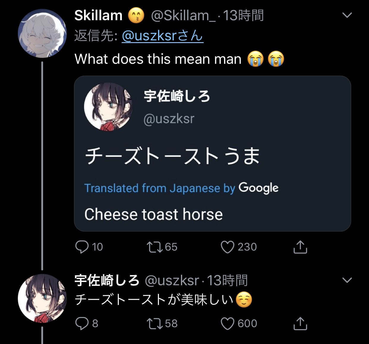 | … | 5126/03/19(木)09:58:51No.1412125451+チーズトーストのトリコって書いても海外の人には虜だって誤解されちゃうのか |