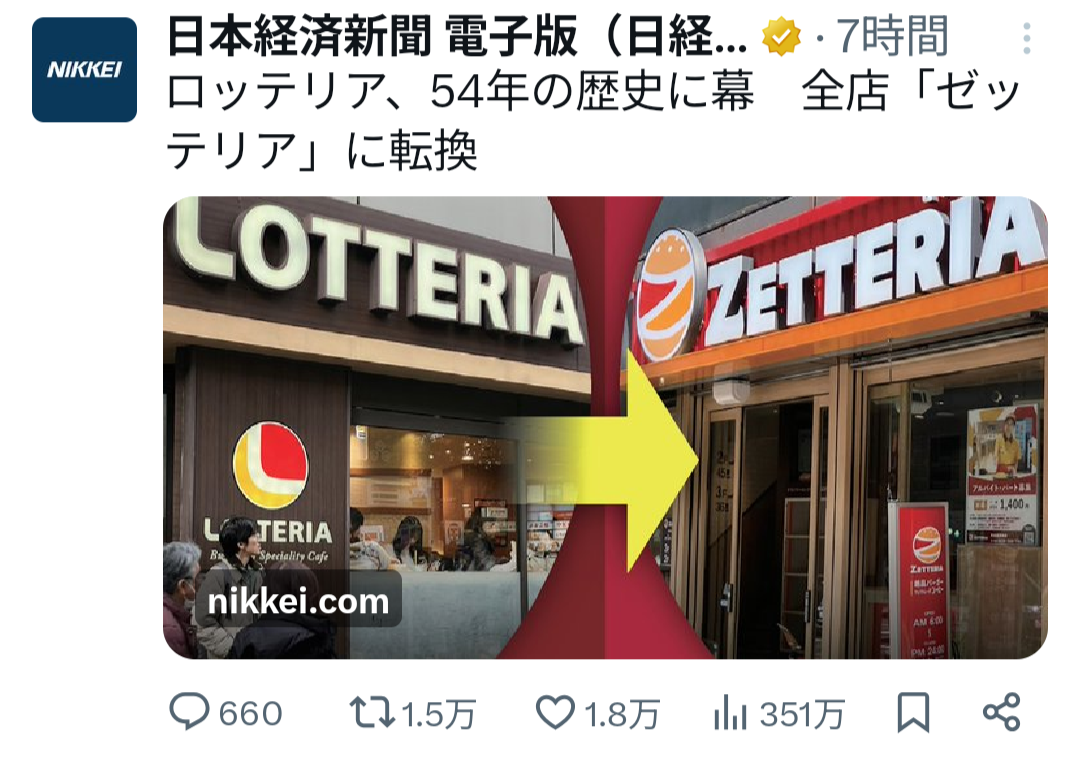 | … | 2026/01/21(水)13:01:24No.1394526559+ロッテリアのブランド捨てるのは惜しいけどロッテとはもう関係ないんだし |