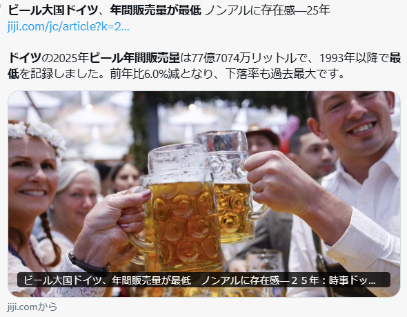 >ドイツ連邦統計局が2日発表した2025年のビールの年間販売量は77億7074万リットルで、1993年の統計開始以来の過去最低を記録した。前年比6.0%減で、下落率も過去最大だった。