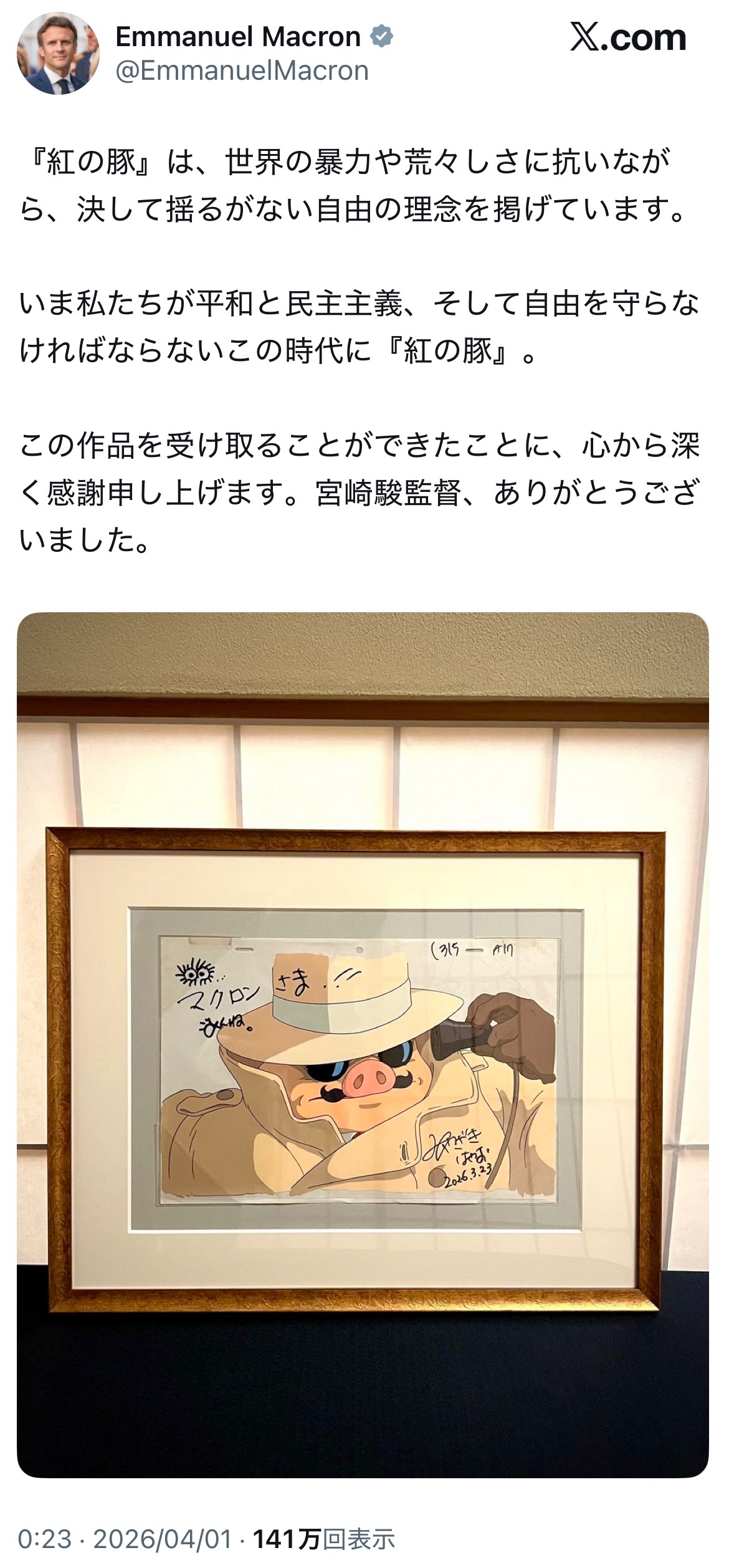 何で🇫🇷大統領に紅の豚の絵を渡してるんだよ!🇮🇹じゃねえのか!