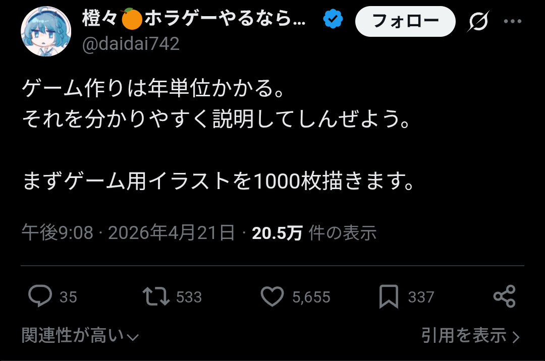 | … | 3726/04/22(水)07:13:48No.1422665349+>長期制作の何がヤバいってほぼ確実に「これは本当に面白いのか?」という自問自答の迷宮に陥るんだよな |