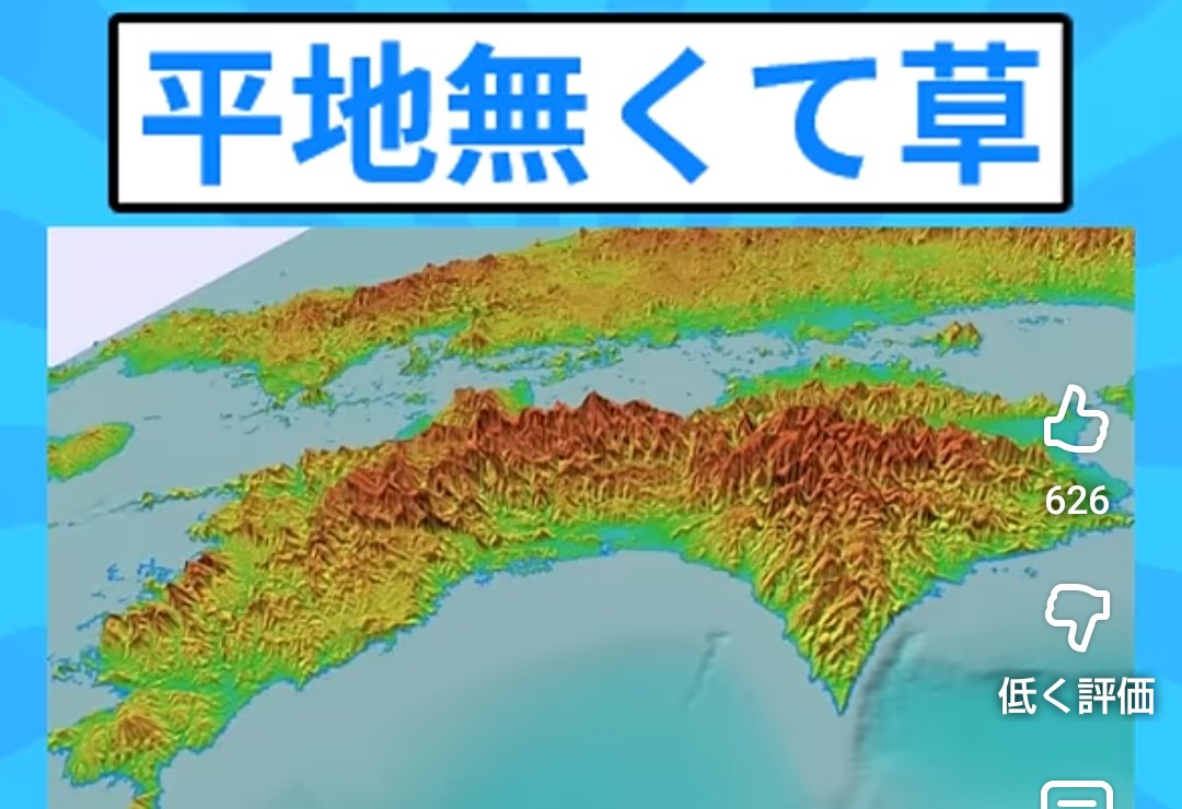 | … | 8226/01/14(水)14:10:41No.1392390113+>瀬戸内海側にはちょっと広めの平野があるけど太平洋側は徳島市と高知市の他にはほとんど山しかないよ |