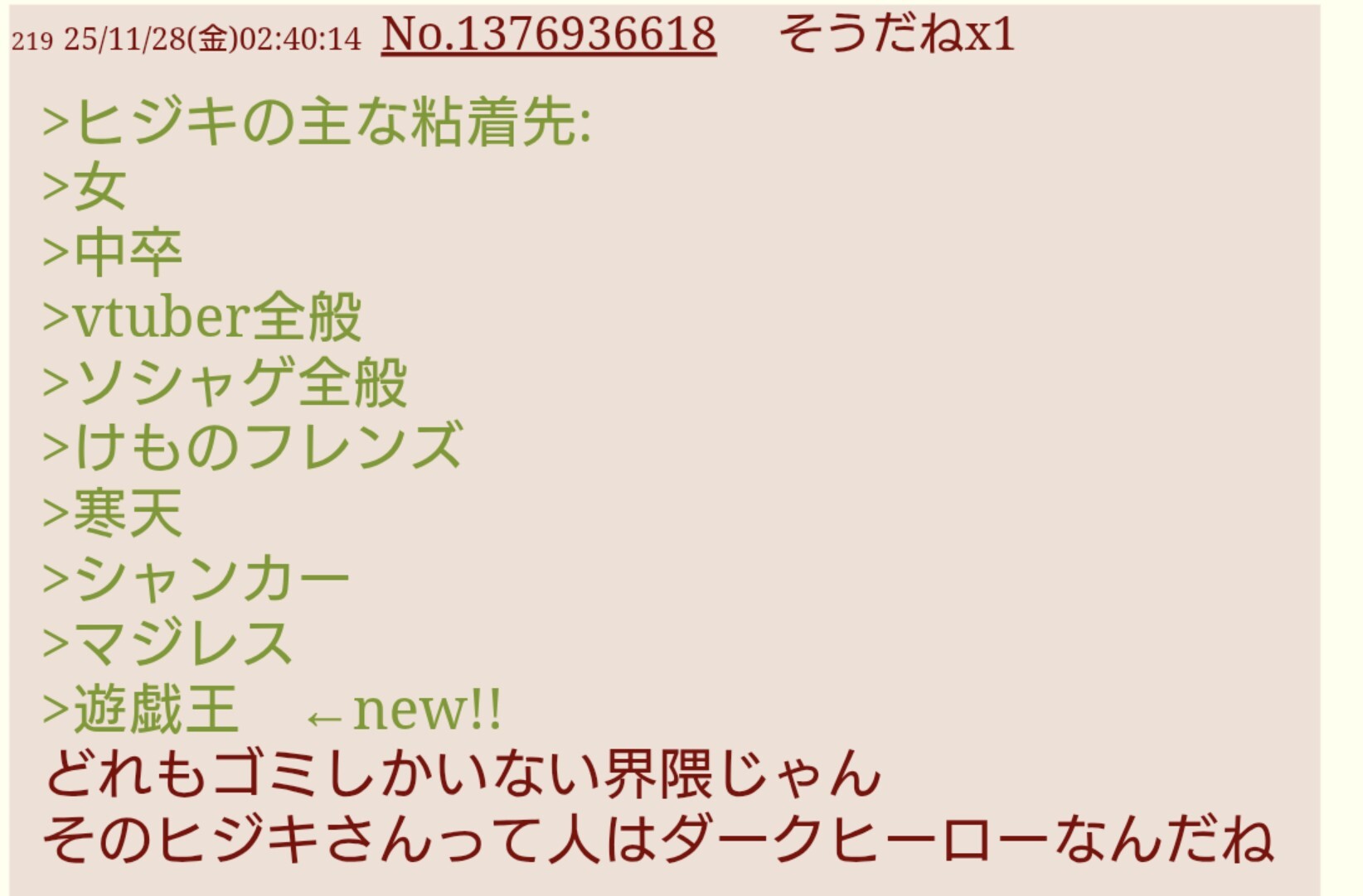 | … | 7025/11/28(金)10:20:50No.1376975879そうだねx8>ヒジキがにじリスなの知らない感じ? |