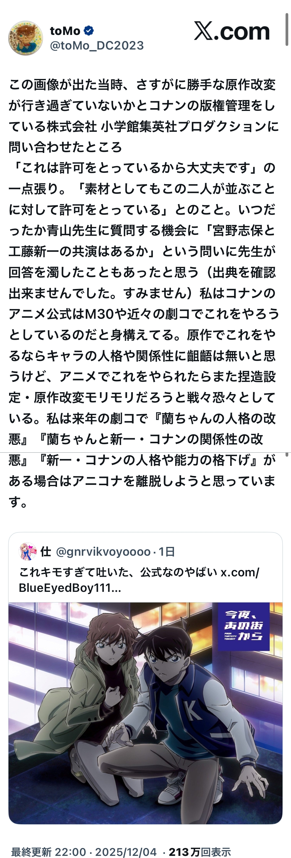 | … | 9425/12/05(金)10:54:07No.1379368339+実際コナンってもう原作者だけの作品じゃなくてアニメスタッフも含めてみんなが共同で作ってる巨大なIPなんだしいつまでも原作者の我が通せると思ってるのも変な話だと思う |