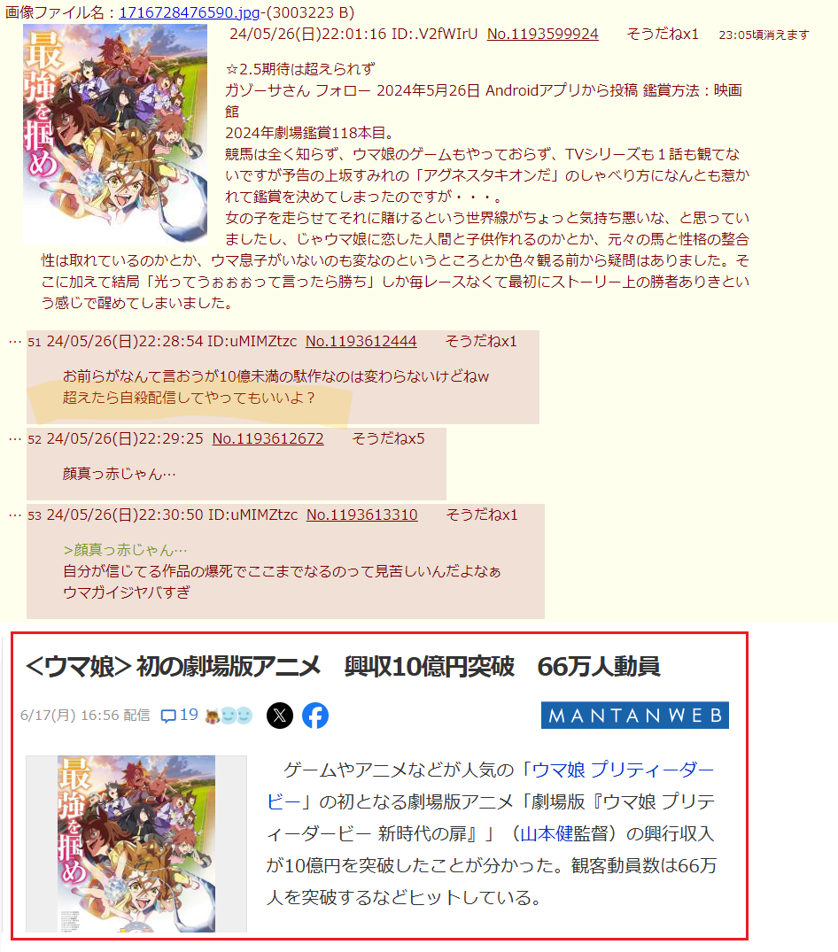 | … | 6025/12/05(金)13:43:32No.1379410814そうだねx3>何故かV粘着しながらウマジだのブルジだの言いだしたから多分こいつ |