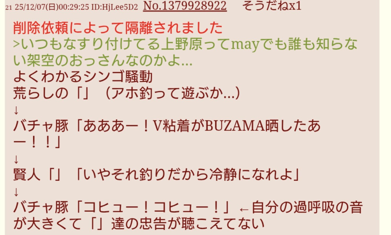 | … | 45925/12/07(日)03:23:53No.1379962947そうだねx1今このスレでsage爺とか騒いでるアホはmayのシャンカーやホロ粘着やら淫夢語録使ってるキチガイの巣を味方につけようとしてて |
