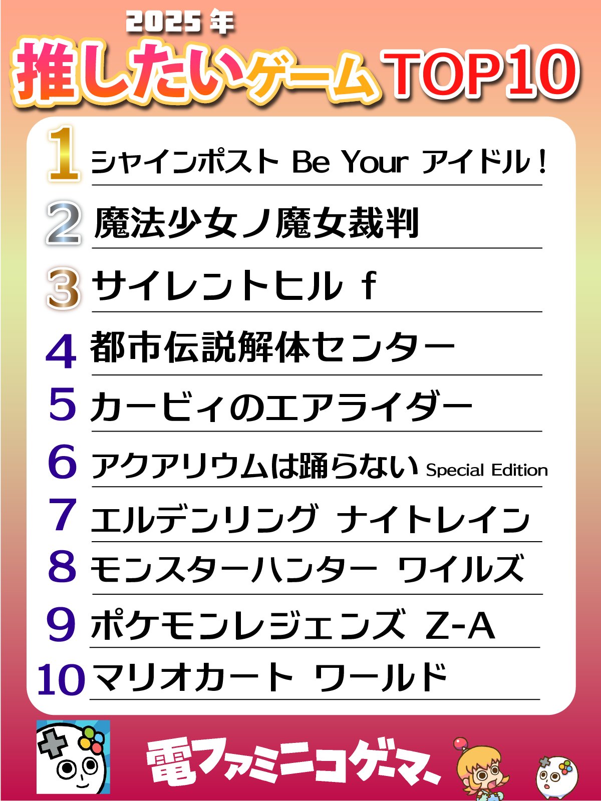 | … | 9425/12/27(土)00:54:47No.1386510355+あくまで票入れた人間が推したいゲームだから誰でも知ってる大作は上位になりにくくてゲーム出るまで色々あったシャインポストや口コミで人気出てるけど知名度もプレイ人口もまだまだ少ないまのさばみたいなインディーズ系が上がりやすいランキングだからな |