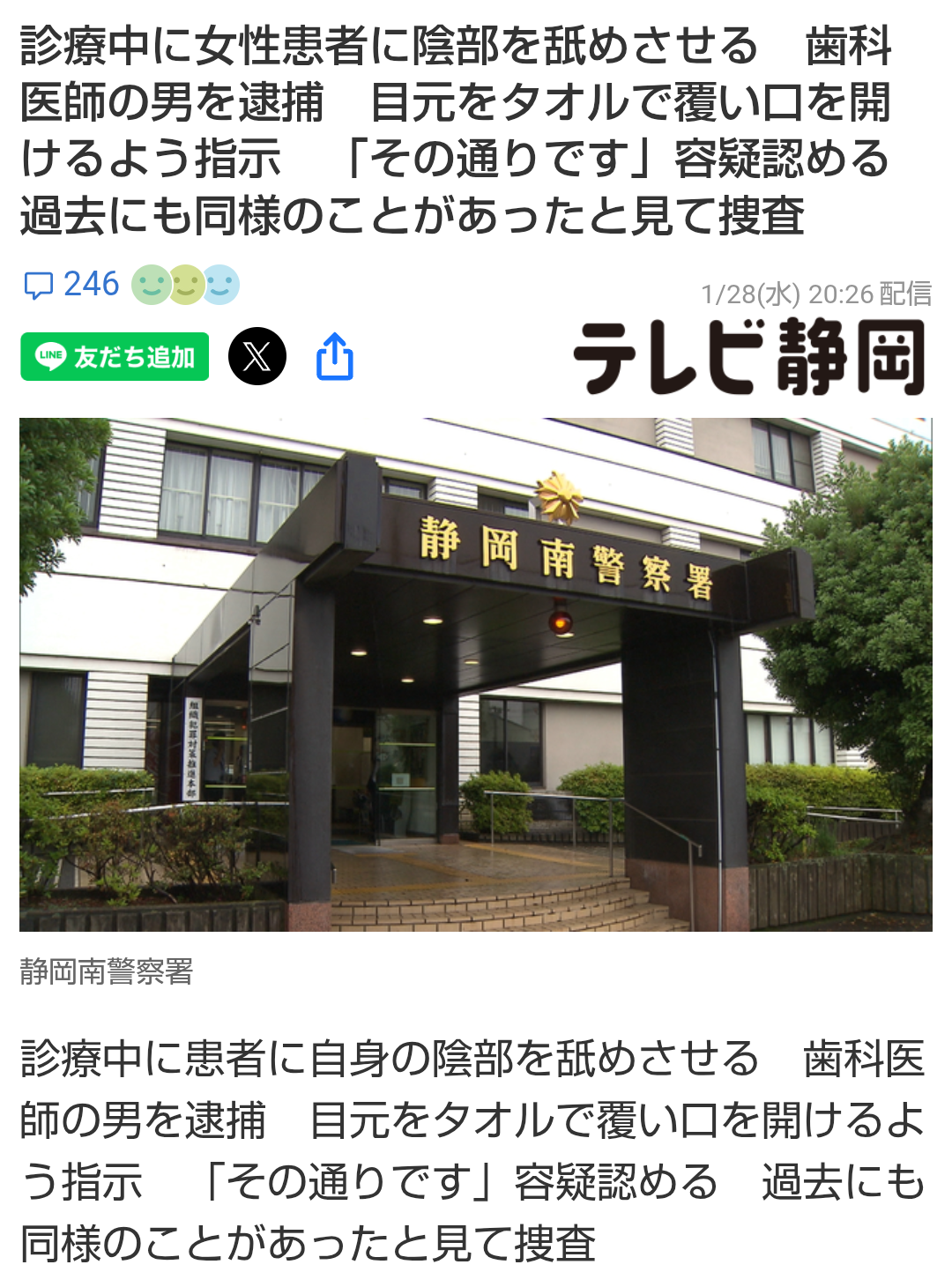 | … | 9126/01/29(木)05:27:25No.1396843421+>被害に遭った女性患者はこれまでにも複数回、同じ歯科医院に通院していて、「以前にも違和感を覚えたことがある」という趣旨の話をしていることから、警察は過去にも同様の行為をしていたと見て捜査しています。 |