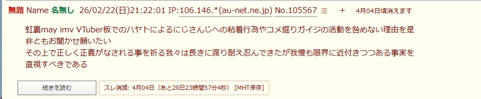 | … | 44026/03/15(日)03:33:46No.1410846828+アイドル部粘着も擦り付けるのか… |