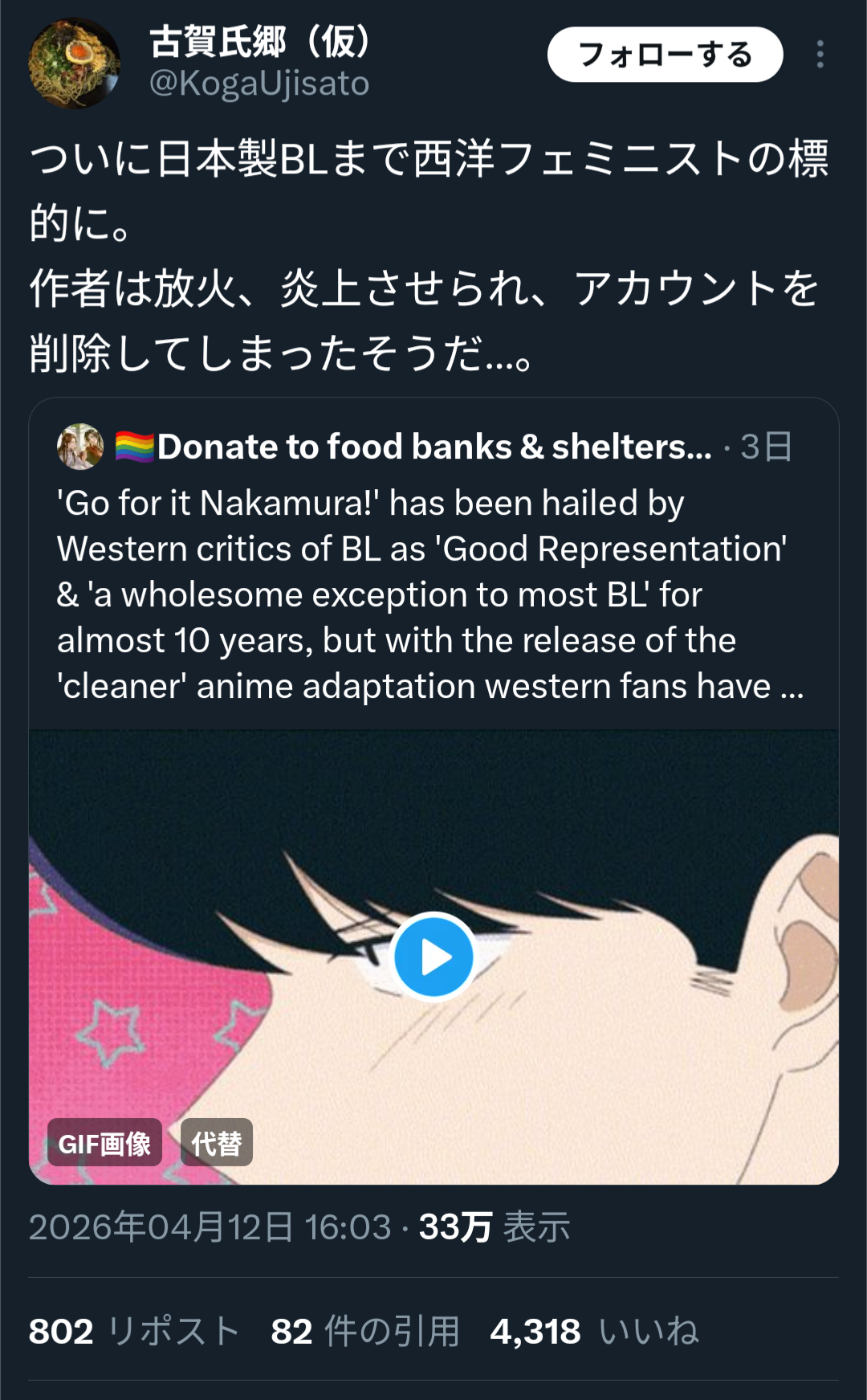| … | 42626/04/13(月)03:10:30No.1419894041そうだねx4フェミニストとBL |