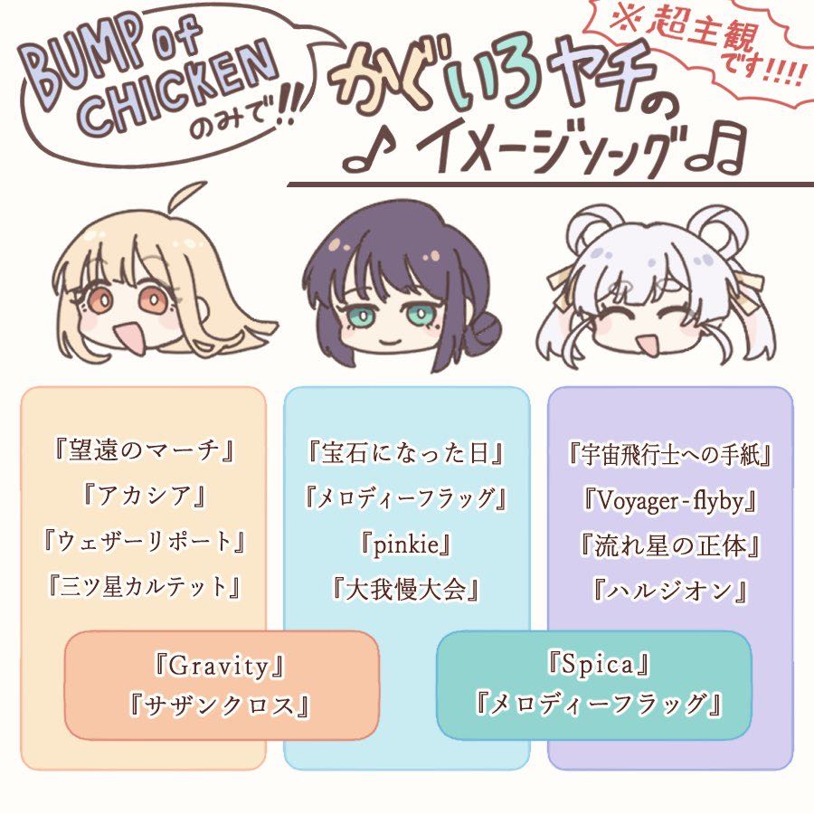 | … | 3726/04/16(木)03:32:44No.1420782764+>この作品に限らずBUMPの歌はキャラソン妄想適性が異様に高いよ |